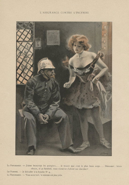 L’assurance contre l’incendie La Froussarde : J’aime beaucoup les pompiers… . Je trouve que c’est le plus beau corps… . Dites-moi : héros obscur, si ça flambait, vous viendriez d’abord me chercher ? Le pompier : Je dois aller à la bouche n° 4. La Froussarde : Vous avez tort, la mienne est plus jolie.