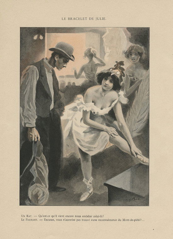 ‘Ma chère’, me racontait une camarade, ‘je me demande pour qui on nous prend ! Je cherche un appartement dans une maison sévère, bien tenue, respectable, ce qu’il nous faut, enfin ; je le trouve, je veux l’occuper, mais va t’faire fich’ : Quand le concierge apprend que je suis du théâtre, il ne veut plus louer ! Enfin, après une foule d’hésitations et de pourparlers, le propriétaire daigne m’accepter dans le Temple en me disant : n’est-ce pas, je compte sur vous, habitez le bourgeoisement ! ‘J’emménage. Tout de suite la vie devient infernale : mon voisin de dessous mène une vie de chien avec des cocottes jusqu’à trois heures du matin ; la dame de dessus veut m’enlever mon ami et la veuve d’en face reçoit tellement de jeunes gens qu’il y a une station de voitures à sa porte. Ça devenait scandaleux… j’ai donné congé.’