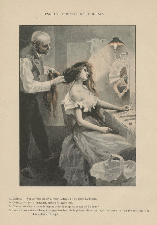Résultat complet des courses La cliente : Voulez-vous un tuyau pour Auteuil, Félix ? Jouez Farandole. Le coiffeur : Merci, madame, mais ça ne gagne pas. La cliente : Vous en avez de bonnes ; c’est le propriétaire qui me l’a donné. Le coiffeur : Alors madame, ferait peut-être bien de le prévenir de ne pas jouer son cheval, je rase son entraineur ; et il m’a donné Bilboquet.