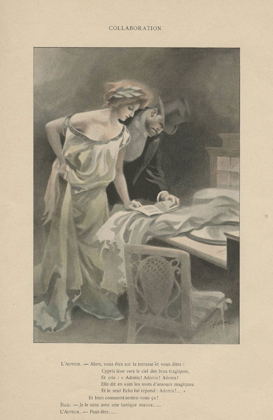 Collaboration L’auteur : Alors vous êtes sur la terrasse et vous dites : Cypris lève vers le ciel des bras tragiques, et crie : Adonis ! Adonis ! Adonis ! Elle dit en vain les mots d’amours magiques. Et le seul Écho lui répond : Adonis !... Et bien comment sentez-vous ça ? Elle : Je le sens avec une tunique mauve… L’auteur : Peut-être…
