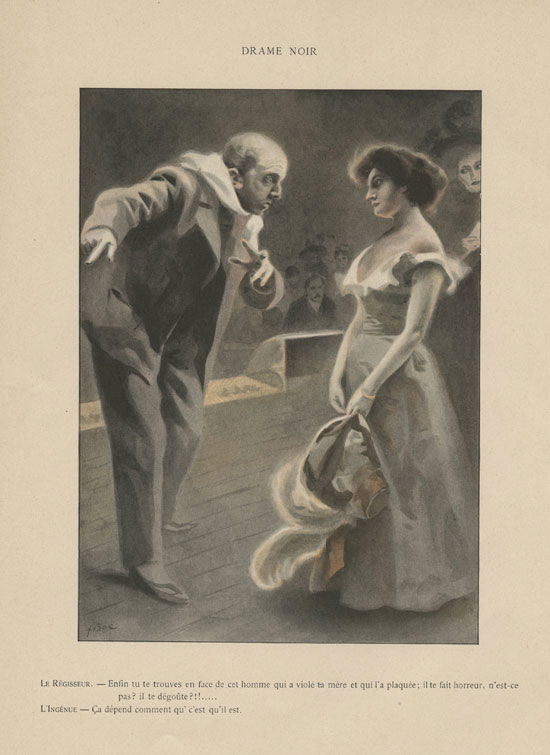 Drame noir Le régisseur : Enfin tu te trouves en face de cet homme qui a violé ta mère et qui l’a plaquée ; il te fait horreur, n’est-ce pas ? il te dégoûte ?88… L’ingénue : ça dépend comment qu’c’est qu’il est.