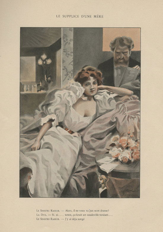 Le supplice d’une mère Le sinistre raseur : Alors, il ne vous va pas mon drame ? La diva : Si, si … tenez, ça ferait un vaudeville tordant… Le sinistre raseur : J’y ai déjà songé.
