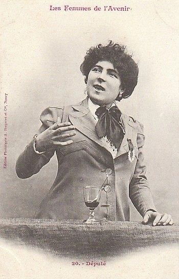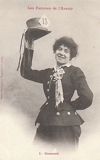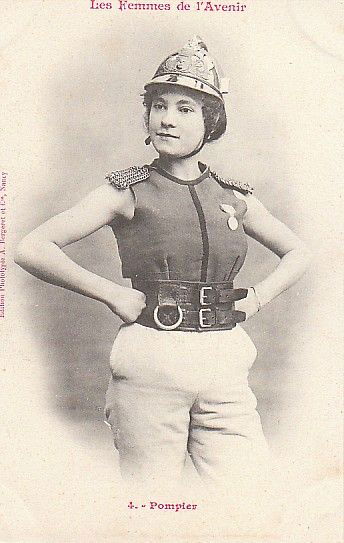 Vers 1902, l’imprimeur-éditeur Albert Bergeret à Nancy publie la célèbre série de cartes postales de fantaisie intitulée Les Femmes de l’Avenir. Ces images ne représentent pas des spectacles précis, mais elles en empruntent tous les codes : décors peints, éclairages étudiés, accessoires symboliques – sabre, lance d’incendie, corde de marin – pour incarner des fonctions alors réservées aux hommes.
