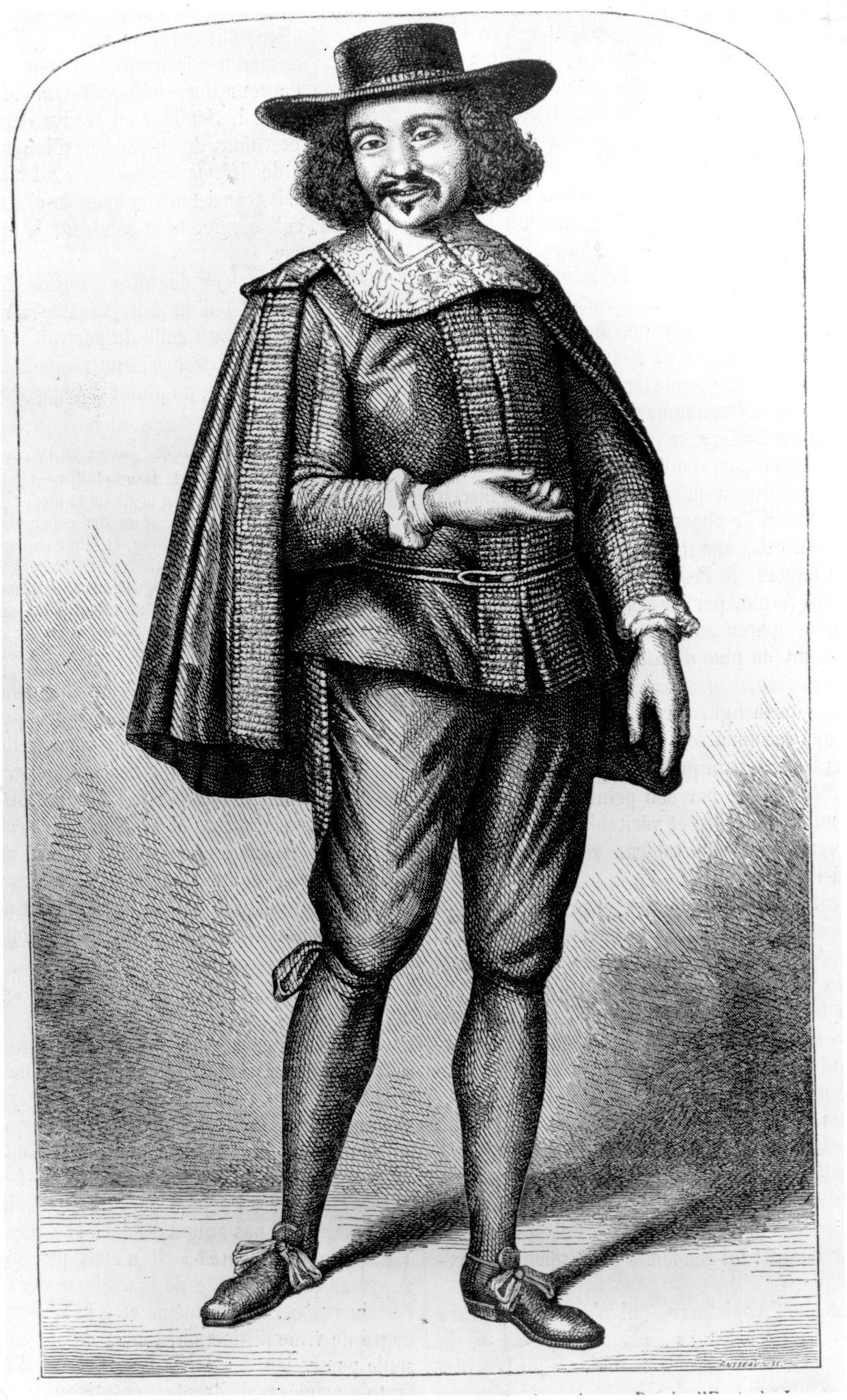 Molière en costume de scène, probablement dans un rôle de comédie vers 1660–1670.