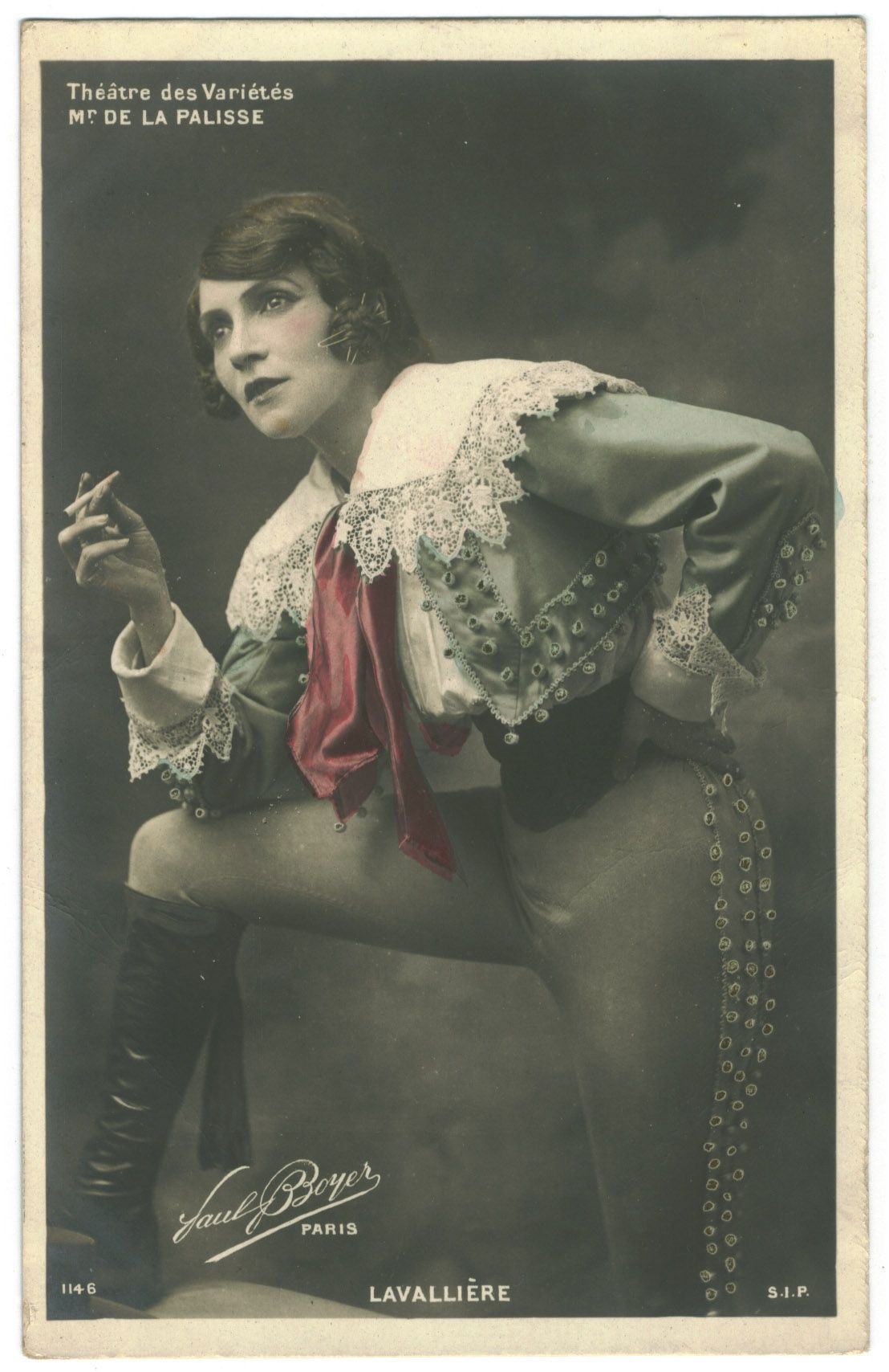 Lavallière, du Théâtre des Variétés, est représentée dans une posture expressive, presque théâtrale. Le costume, structuré par un corset et rehaussé de dentelles, accompagne une attitude marquée, centrée sur le jeu et l’expression du personnage.