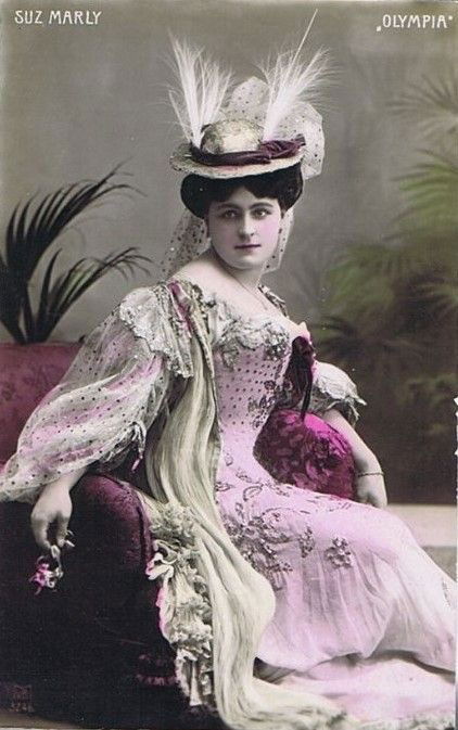 Suz Marly apparaît dans une robe délicatement ornée, aux teintes roses et ivoire, soulignée de broderies fines et de transparences légères. La coiffe agrémentée de plumes accentue la verticalité de la silhouette, tandis que l’attitude assise, légèrement tournée vers l’objectif, traduit une élégance maîtrisée.