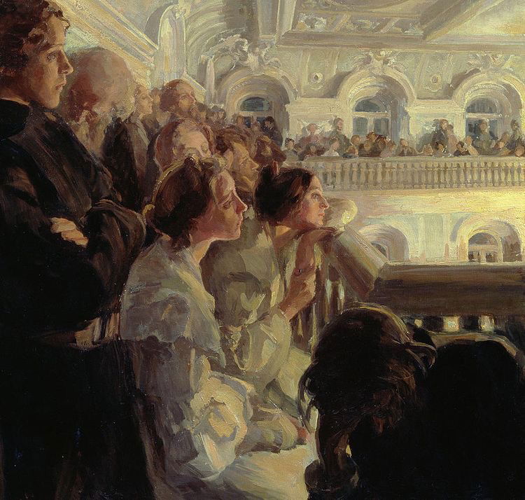 Dans ses scènes de théâtre et d’opéra, la scène disparaît souvent hors champ. Le véritable sujet devient le public, ces silhouettes penchées au balcon, absorbées par l’invisible. Le spectacle se devine à travers l’intensité des regards. Son œuvre témoigne d’un monde culturel raffiné, celui de la Russie urbaine du début du 20ᵉ siècle, qu’elle observe avec délicatesse et retenue.