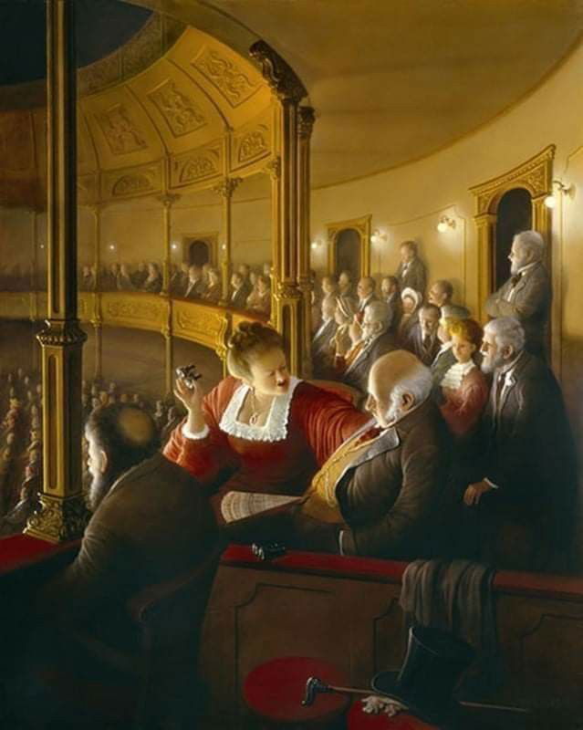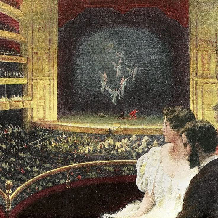 Cette scène d’opéra nous place dans une loge latérale. Tandis que le spectacle se joue hors champ, l’attention se déplace vers les spectateurs. Une femme en robe rouge, espiègle et vivante, se penche vers un homme âgé absorbé par son programme. Le contraste entre la lumière dorée de la salle et l’intimité de la loge crée une atmosphère à la fois élégante et légèrement ironique. Ici, le véritable spectacle n’est peut-être pas sur scène, mais dans les regards, les gestes et les petits drames mondains qui se jouent dans l’ombre des balcons.