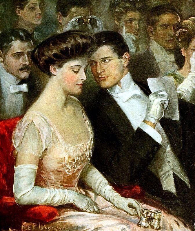 Dans une loge d’opéra, un homme élégant se penche vers une jeune femme au regard baissé. Autour d’eux, la foule est présente, mais semble s’effacer. La lumière douce souligne les visages, les gants blancs, le velours rouge du siège. Underwood ne montre pas la scène : il montre l’instant suspendu d’un échange discret, où le véritable spectacle se joue entre deux regards.