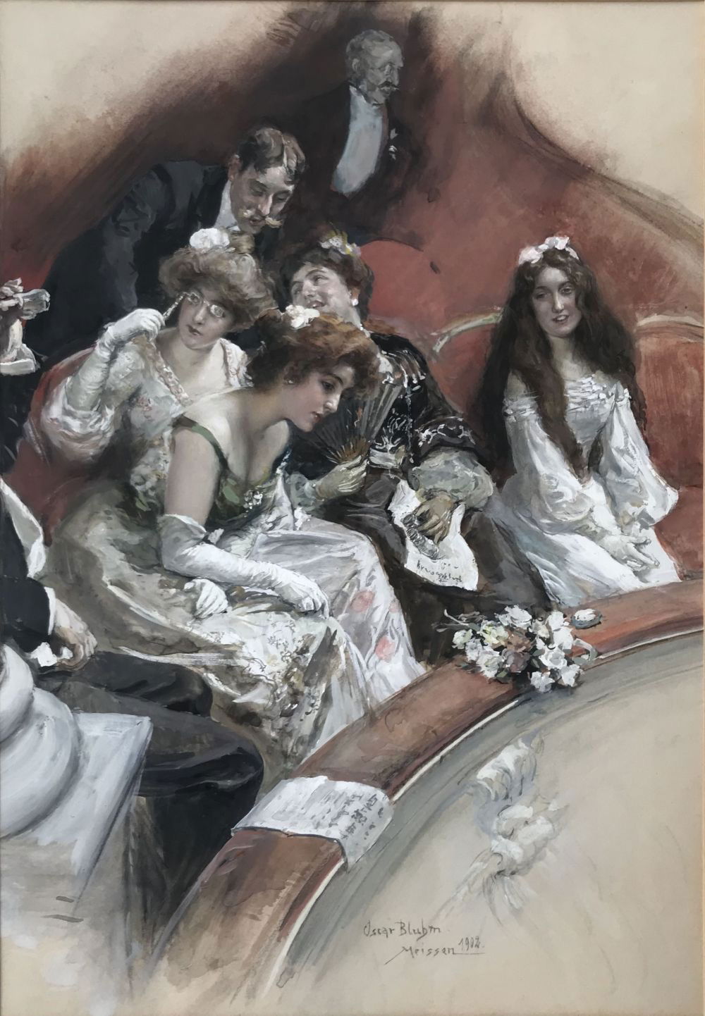 Dans cette scène de loge d’opéra, des femmes en robes claires et gants longs se penchent au-dessus du balcon, observant la salle ou la scène invisible. Les regards se croisent, les éventails s’ouvrent, les conversations murmurent. Bluhm ne peint pas le spectacle lui-même, mais l’instant social qui l’entoure.