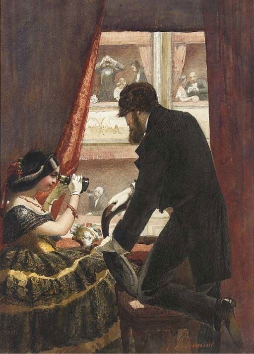 Dans cette scène vue depuis une loge, une femme élégante observe la scène à l’aide de jumelles tandis qu’un homme se penche vers elle. Derrière eux, la salle apparaît en profondeur, animée par les spectateurs et les lumières. La scène elle-même reste secondaire. L’attention se concentre sur le jeu des regards, la proximité des corps, la mise en scène sociale du théâtre. L’opéra devient ici un espace de représentation double : celui du spectacle et celui des relations humaines.