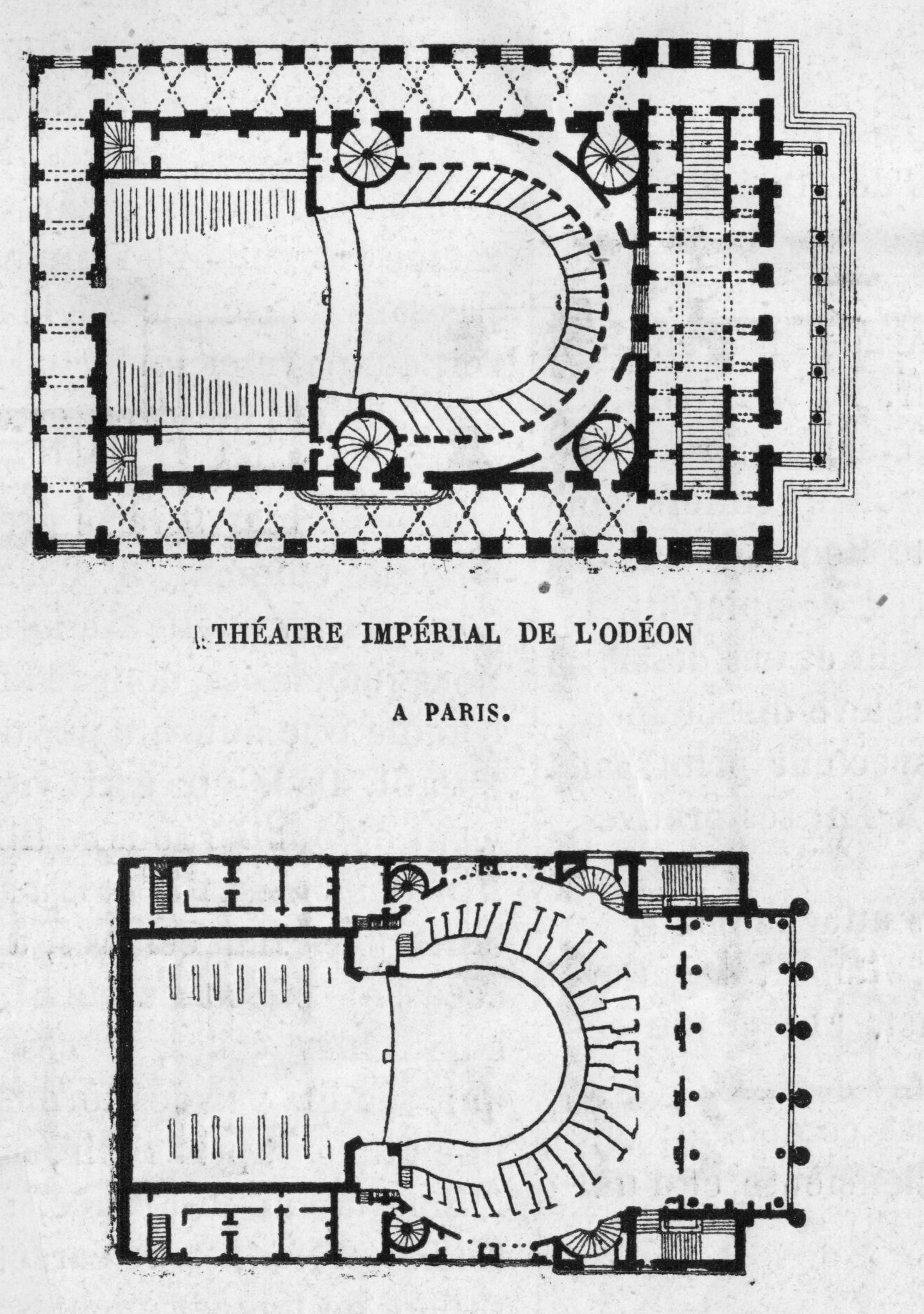 Espace réglementé Ce plan du théâtre de l’Odéon illustre l’organisation rigoureuse des salles privilégiées avant 1791. Architecture, circulation et disposition du public participent d’un contrôle étroit des usages, reflet d’un théâtre soumis à des règles institutionnelles aussi précises que contraignantes.