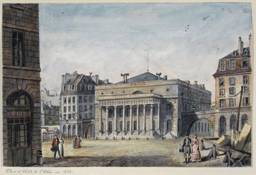 Un théâtre dans la ville Cette vue d’un grand théâtre parisien au tournant des XVIIIᵉ et XIXᵉ siècles montre son inscription directe dans l’espace urbain. Devenu monument civique autant que lieu de spectacle, le théâtre s’affirme comme un repère culturel, accessible au public et intégré à la vie quotidienne de la capitale.