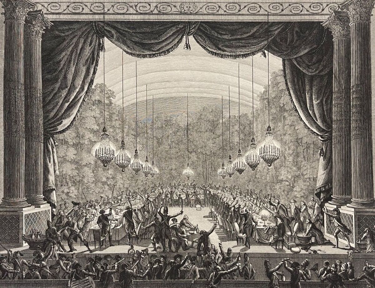 Ce foyer animé du théâtre Montansier illustre le rôle central du Palais-Royal dans la vie théâtrale parisienne à la veille et au début de la Révolution. Plus qu’un simple lieu de passage, il est un espace de sociabilité où se croisent artistes, spectateurs et figures politiques, reflet de l’effervescence culturelle née de la liberté des théâtres en 1791.