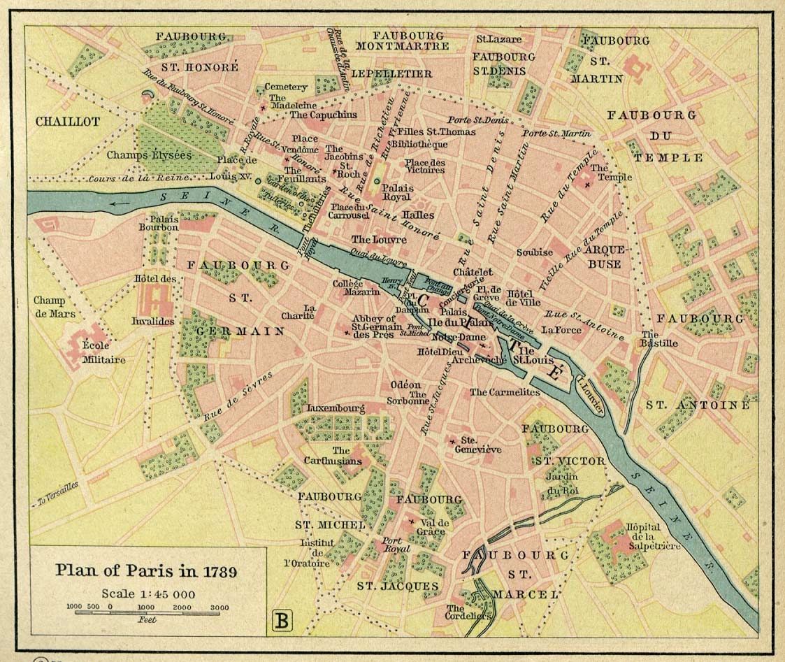 Géographie de la liberté Ce plan de Paris à la fin du XVIIIᵉ siècle permet de situer l’implantation des théâtres au moment de la rupture de 1791. Il révèle une ville dense, propice à la multiplication rapide des salles, depuis les quartiers centraux jusqu’aux faubourgs, où la liberté nouvelle redessine la carte du spectacle.