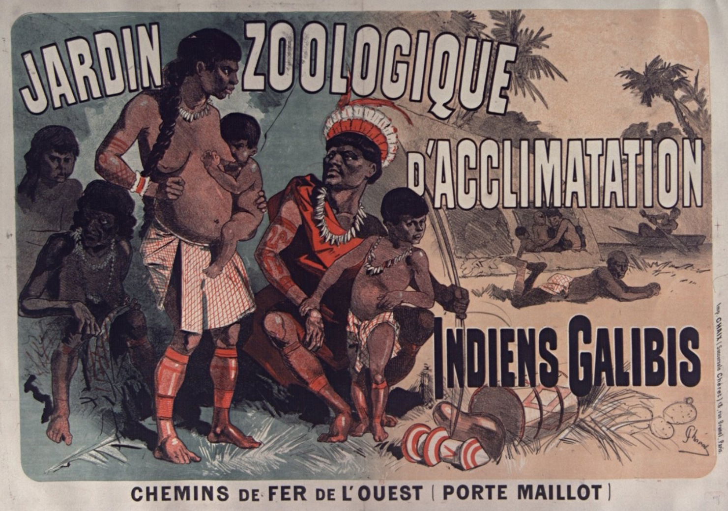 Jardin zoologique d'acclimatation. 1882. Indiens Galibis. Chemins de fer de l'Ouest (Porte Maillot). Affiche : Jules Chéret (1836-1932). Illustrateur. Source gallica.bnf.fr / BnF. Affiche annonçant une exposition d’« Indiens Galibis » au Jardin d’Acclimatation (Paris, fin du XIXᵉ siècle). L’image mêle exotisme, mise en scène coloniale et vocabulaire zoologique, révélant la manière dont ces populations étaient assimilées à des curiosités naturelles plutôt qu’à des êtres humains.