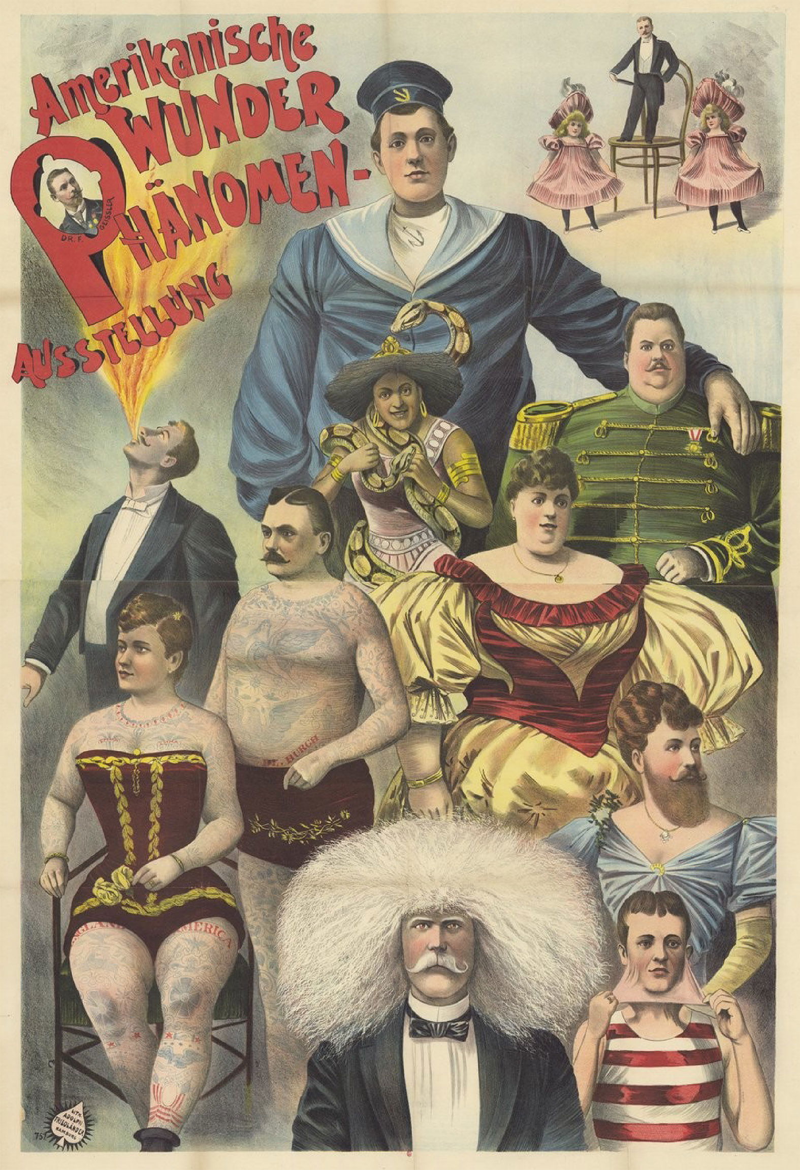 Affiche lithographiée allemande de la fin du XIXᵉ siècle annonçant une Amerikanische Wunder-Phänomen-Ausstellung. Cette image rassemble volontairement, sur une seule composition, plusieurs figures emblématiques des phénomènes de foire. Elle illustre la standardisation des spectacles de curiosités à la Belle Époque, où les individus sont présentés comme une collection vivante de différences humaines, destinée à attirer un public toujours plus large.
