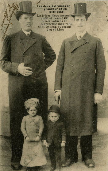 Cette carte postale illustre les deux extrêmes du corps humain, en réunissant les frères Hugo, géants de plus de 2,30 m, et Le Colibri, célèbre pour sa très petite taille. Par la confrontation directe des statures, renforcée par la présence d’enfants servant d’échelle, l’image met en scène un contraste spectaculaire typique des spectacles de curiosités du début du XXᵉ siècle, où la différence physique devient attraction visuelle et argument publicitaire.