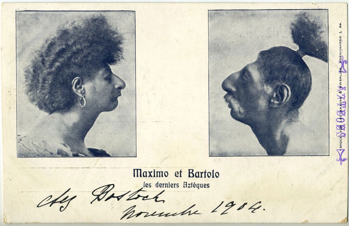 Cette carte postale montre Maximo et Bartola en portraits de profil, selon une iconographie proche des usages anthropologiques de l’époque. La note manuscrite « chez Bostock, novembre 1904 » indique qu’ils se produisaient alors au sein de la grande ménagerie-cirque de Frank Bostock, l’un des plus importants entrepreneurs de spectacles itinérants du début du XXᵉ siècle. Cette mention situe précisément leur carrière tardive et confirme leur intégration aux grands circuits internationaux du spectacle.