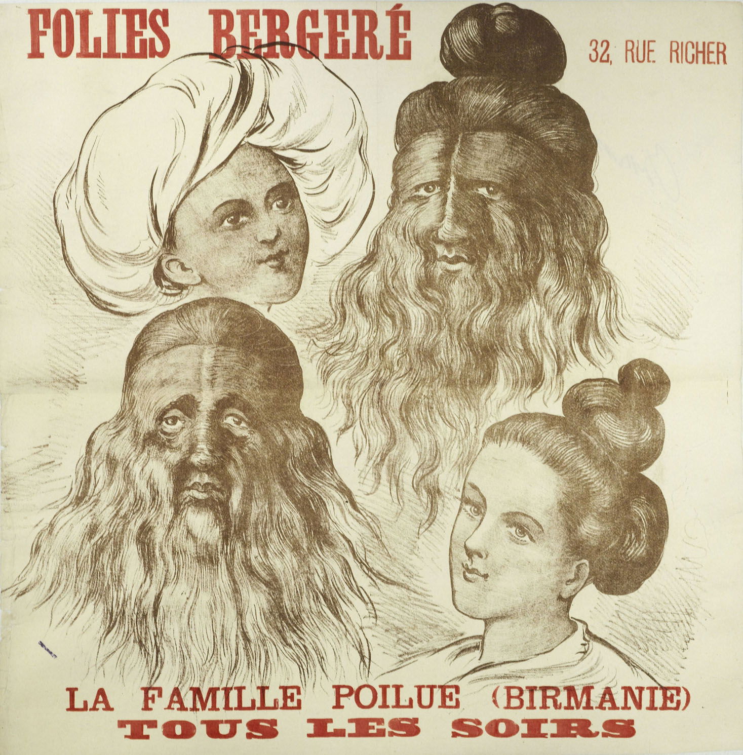 La famille poilue fut présentée comme attraction humaine au Folies-Bergère à Paris entre 1880 et 1900. Il s’agissait d’une famille réelle, dont plusieurs membres, adultes et enfants, étaient atteints d’hypertrichose congénitale, une affection génétique rare provoquant une pilosité très abondante sur le visage et parfois sur l’ensemble du corps. Présentée comme originaire de Birmanie, la famille était intégrée à une mise en scène jouant sur l’exotisme, selon les codes culturels de la fin du XIXᵉ siècle. Cette origine, souvent mise en avant dans les affiches, relevait parfois davantage de la construction publicitaire que d’une réalité strictement documentée. Leur présentation s’inscrit dans la tradition des exhibitions humaines de la Belle Époque, où les music-halls associaient numéros artistiques et curiosités corporelles.