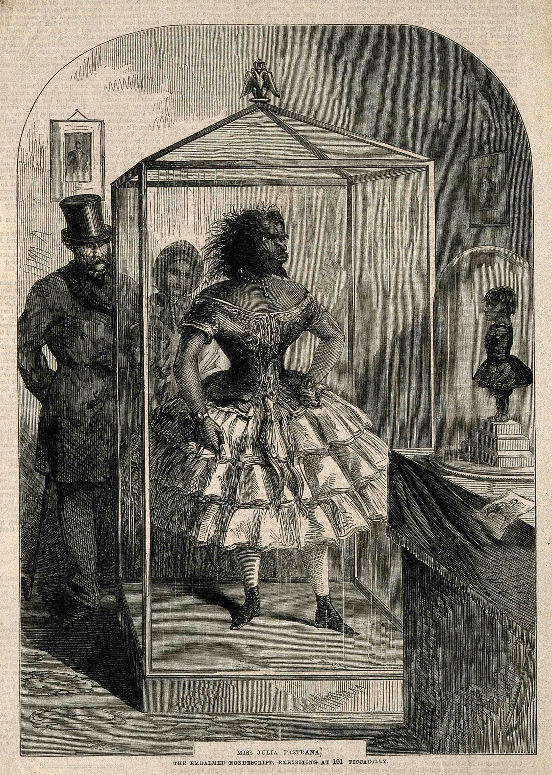 Gravure sur bois publiée dans The Illustrated London News (Angleterre, vers 1862). Elle représente le corps embaumé de Julia Pastrana, exposé à Londres après sa mort.