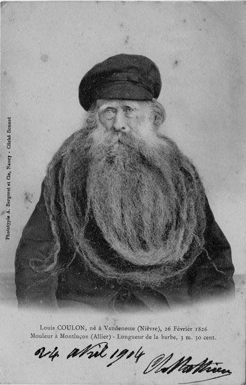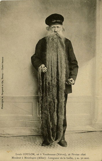 Louis Coulon, né en 1826 à Vandenesse (Nièvre), exerçait le métier de meunier à Montluçon lorsqu’il devint connu pour la longueur exceptionnelle de sa barbe, mesurée à environ cinq mètres trente. Documentée par des photographies de studio à la fin du XIXᵉ siècle, sa barbe authentique attira l’attention des curieux et des savants, à une époque où la photographie servait à fixer et à attester les singularités humaines. Contrairement à de nombreux phénomènes de foire, Louis Coulon conserva son identité civile et semble être resté en marge du spectacle itinérant, incarnant une curiosité naturelle observée plus que mise en scène.