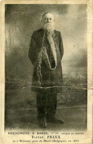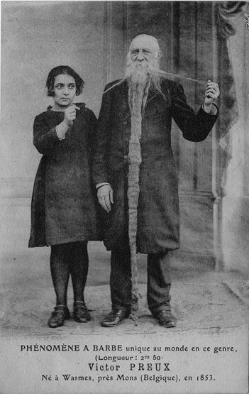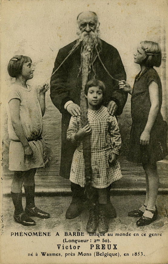 Victor Preux (né en 1853 à Wasmes, près de Mons en Belgique) est l’un des phénomènes à barbe les plus remarquables de la fin du XIXᵉ et du début du XXᵉ siècle. Atteint d’une hypertrichose exceptionnelle, il est célèbre pour la longueur extraordinaire de sa barbe, annoncée jusqu’à 2,50 mètres, ce qui lui vaut d’être présenté comme un cas « unique au monde ». Victor Preux est exhibé dans les foires, expositions et spectacles de curiosités à travers l’Europe. Les photographies et cartes postales le montrent souvent entouré d’enfants ou de proches, tenant sa barbe déployée, afin d’en souligner visuellement la démesure. Contrairement aux femmes à barbe, sa pilosité est ici associée à une figure masculine âgée, presque patriarcale, accentuant l’étrangeté tout en inspirant une certaine solennité. Peu d’éléments sont connus de sa vie privée en dehors de son exploitation scénique, mais son image demeure l’un des témoignages les plus frappants de la fascination du XIXᵉ siècle pour les excès pileux et les corps hors norme.