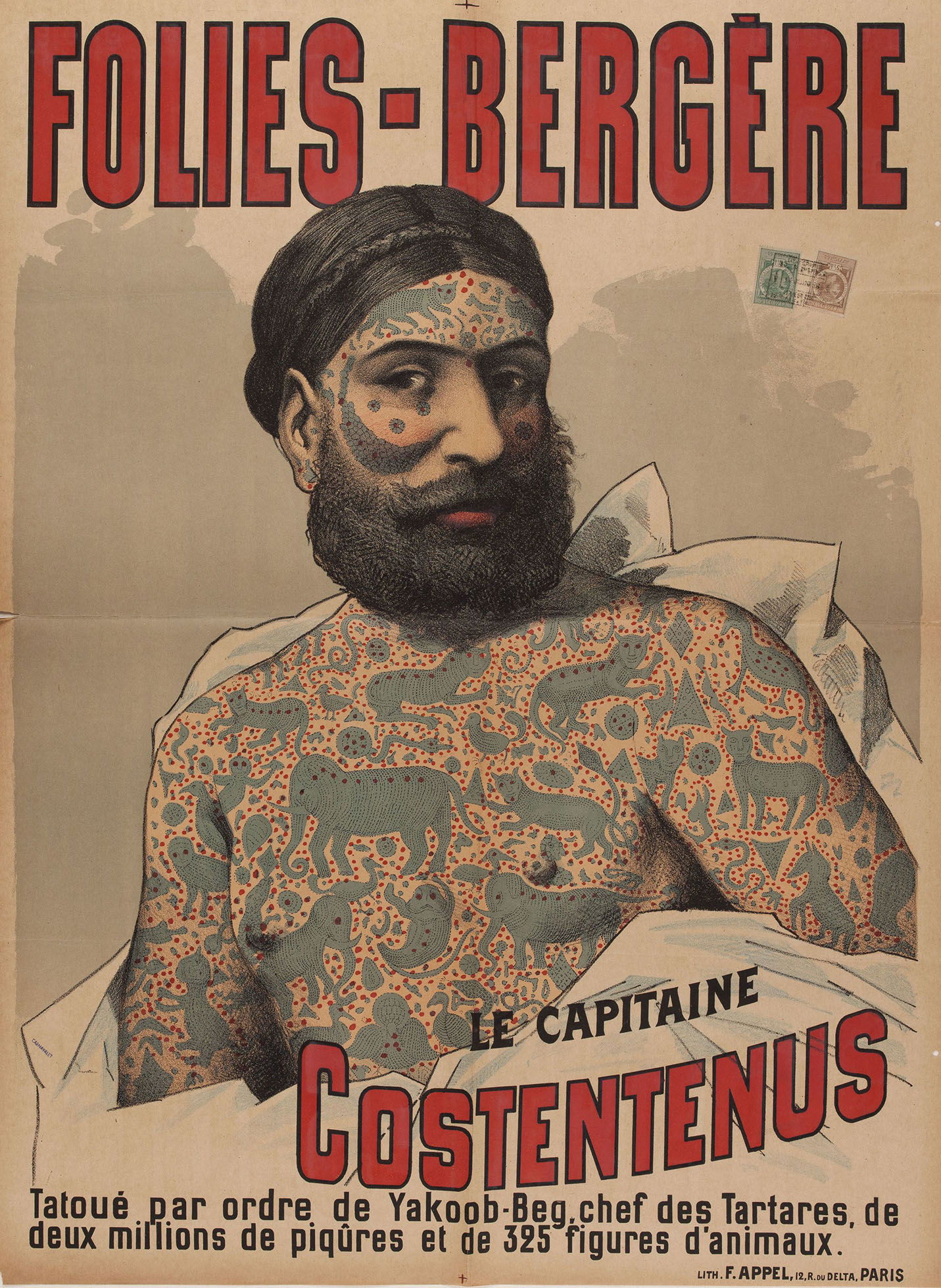 Folies-Bergère. La capitaine Costentenus Tatoué par ordre de Yakoob-Beg, chef des Tartares, de deux millions de piqûres et de 325 figures d'animaux. Anonyme , Dessinateur Imprimerie Lith. F.A. Appel , Imprimeur En 1889 Musée Carnavalet, Histoire de Paris