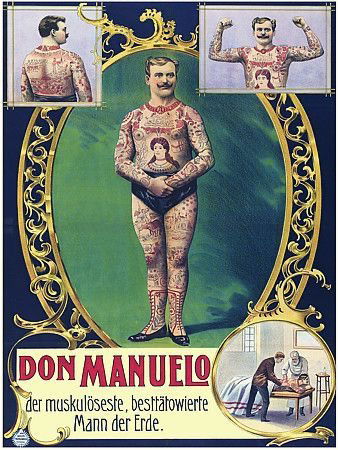 À la fin du XIXᵉ siècle, Don Manuelo est présenté dans les foires et spectacles européens comme « le plus musclé et le plus tatoué des hommes de la Terre ». Son corps, entièrement couvert de tatouages, devient l’attraction principale du spectacle. Associant force physique et peau illustrée, il incarne l’une des figures les plus emblématiques des phénomènes humains, où le corps transformé est exhibé comme une œuvre vivante, à la fois preuve de singularité et objet de fascination.