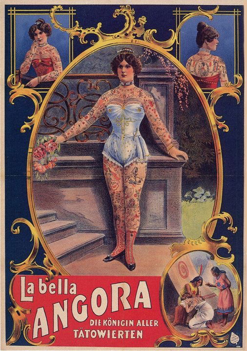 Connue sous le nom de scène La Bella Angora, cette femme entièrement tatouée fut l’une des attractions les plus marquantes des spectacles de curiosités de la fin du XIXᵉ siècle. Présentée sur les affiches comme « la reine de toutes les personnes tatouées », elle connut un important succès en Europe, notamment dans l’espace germanophone et en France, où ce type de spectacle attirait un public nombreux. Son véritable nom est parfois donné comme Aimée Marguerite Julie Chouinard, et son origine comme canadienne-française. Toutefois, ces informations ne sont pas formellement attestées par des sources d’archives contemporaines et doivent être considérées avec prudence. Comme pour de nombreuses figures des phénomènes de foire, son identité civile demeure en partie incertaine, éclipsée par une iconographie publicitaire omniprésente. La Bella Angora affirmait avoir été tatouée par des peuples autochtones d’Amérique, un récit fréquemment utilisé à l’époque pour renforcer l’exotisme et le mystère entourant les corps tatoués. Ce type de narration relève très probablement de la mise en scène commerciale, les tatouages étant le plus souvent réalisés par des professionnels occidentaux dans un cadre contractuel.