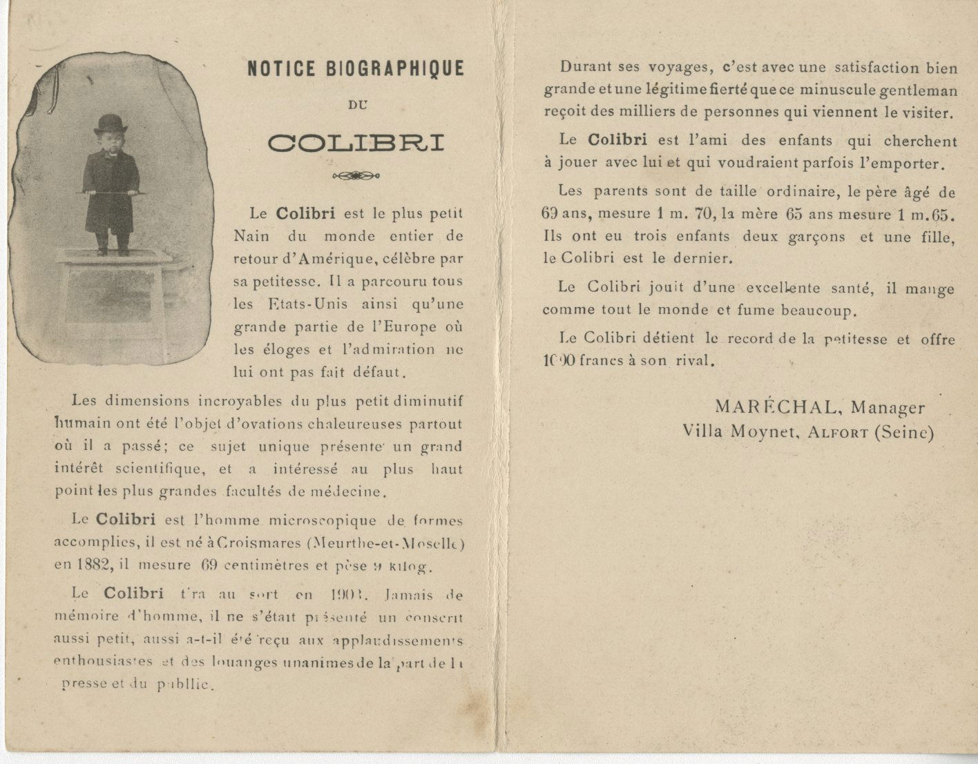 Le Colibri, né en 1882 à Croismare (Meurthe-et-Moselle), est présenté au début du XXᵉ siècle comme « le plus petit nain du monde ». Mesurant 69 centimètres pour 9 kilos, il devient une attraction majeure des spectacles de curiosités, où sa petite taille est mise en avant comme un record absolu. La carte postale recto–verso qui lui est consacrée associe une photographie démonstrative, jouant sur le contraste extrême des tailles, à une notice biographique promotionnelle. Le texte insiste sur ses tournées en Europe et aux États-Unis, sur l’admiration du public et l’intérêt des milieux médicaux, cherchant à légitimer l’exposition de son corps par un discours à la fois scientifique et spectaculaire. Présenté comme jouissant d’une excellente santé, Colibri est décrit dans un registre volontairement rassurant et familier, destiné à humaniser l’attraction tout en accentuant son caractère exceptionnel. Son parcours illustre parfaitement la logique des phénomènes de petite taille : une combinaison d’image, de chiffres et de récit, transformant la singularité physique en identité publique et en moyen de subsistance.