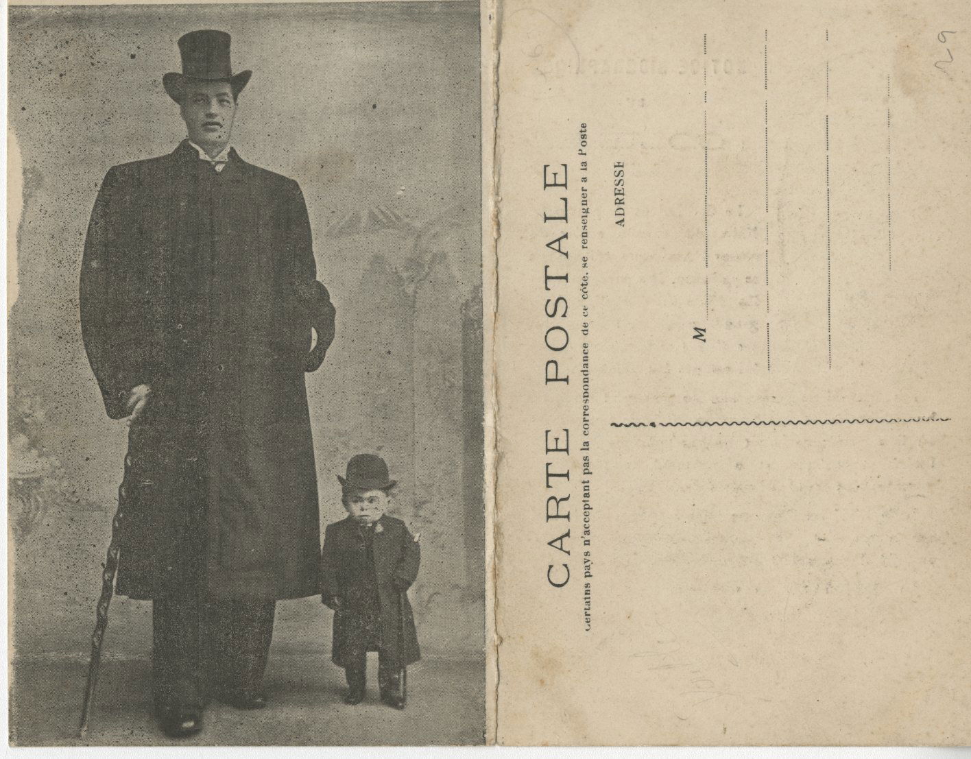 Photographie de studio française diffusée sous forme de carte postale à la fin du XIXᵉ siècle. Représentant les artistes connus sous les noms de scène Titan et Pygmée, dits « nains béarnais », cette image était destinée à la promotion des spectacles de curiosités et à la vente de souvenirs. Comme beaucoup de cartes postales foraines, elle ne mentionne ni le photographe ni l’identité civile des personnes représentées.