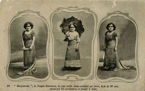 Marguerita est une artiste de petite taille active au début du XXᵉ siècle, connue dans les spectacles de curiosités sous le surnom de « la poupée bernoise ». Présentée comme un cas exceptionnel, elle est annoncée dans la publicité pour sa très petite taille (environ 65 cm) et son poids extrêmement faible, chiffres destinés à frapper l’imaginaire du public. Sa mise en scène repose sur une esthétisation marquée de la petite taille : robes élégantes, accessoires raffinés, poses répétées rappelant l’univers de la poupée. Cette représentation transforme la singularité corporelle en figure décorative et théâtrale, particulièrement associée aux phénomènes féminins. Peu d’éléments sont connus de sa vie personnelle, mais Marguerita incarne une catégorie bien précise des spectacles de curiosités : celle des femmes de très petite taille, où la fascination pour la dimension extrême se combine à une construction visuelle empruntée aux codes de la féminité idéalisée.