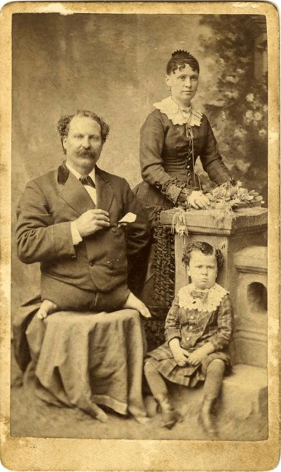 Eli Bowen (1844–1924) est l’un des artistes de spectacle les plus célèbres du XIXᵉ siècle, connu sous les surnoms de « Phénomène sans jambes » et « l’Automobile humaine ». Né sans membres inférieurs, il développe très tôt une agilité exceptionnelle, se déplaçant avec rapidité et exécutant des acrobaties spectaculaires qui feront sa renommée internationale. Il se produit pendant des décennies dans les cirques, foires et grands sideshows, notamment avec le Barnum & Bailey Circus, devenant l’un des artistes les mieux payés de son temps. Contrairement à l’image misérabiliste souvent associée aux phénomènes, Eli Bowen est présenté — et se présente lui-même — comme un athlète accompli, maîtrisant parfaitement son corps. La photographie le montre dans un portrait familial, entouré de son épouse et de son enfant. Ce type d’image, fréquent dans sa carrière, vise à humaniser et normaliser le phénomène, en soulignant sa capacité à fonder une famille et à mener une vie stable, tout en rappelant implicitement l’extraordinaire singularité de son corps.