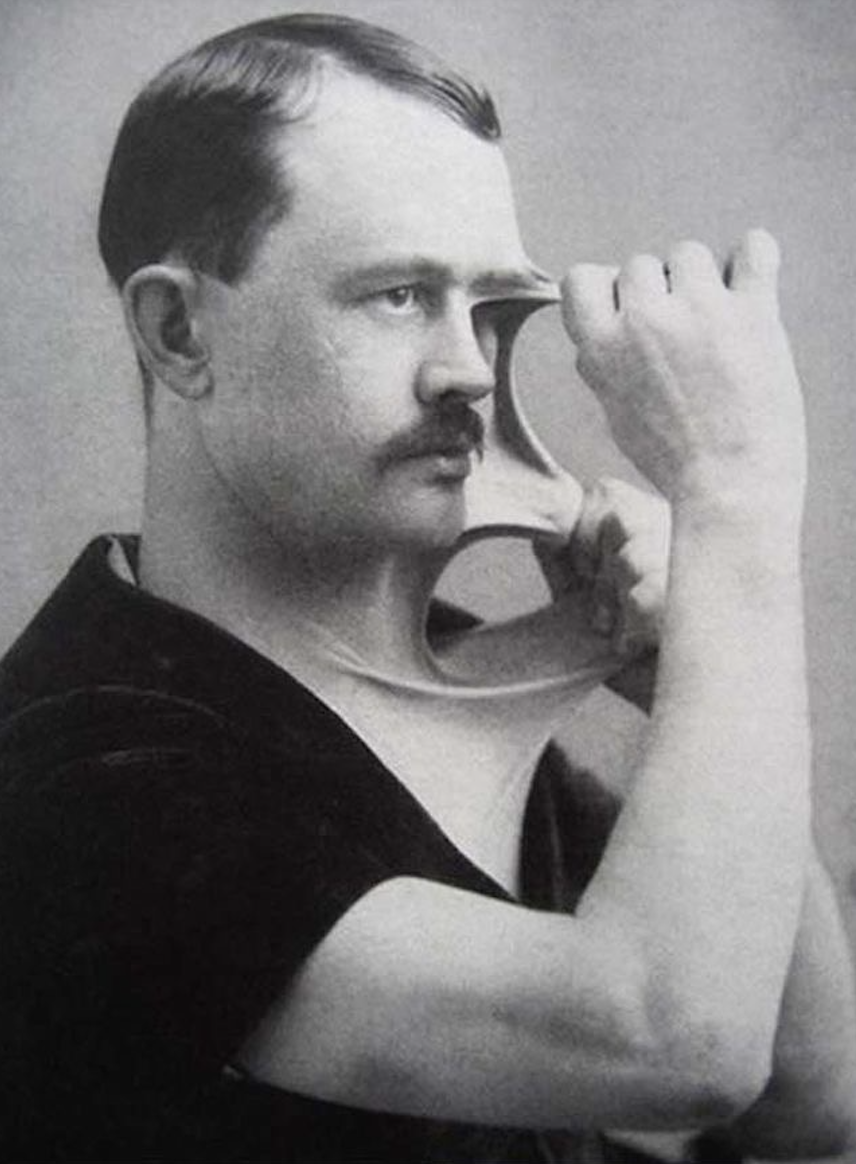 Felix Wehrle est un artiste de curiosités actif à la fin du XIXᵉ et au début du XXᵉ siècle, célèbre pour sa peau exceptionnellement extensible. Cette particularité, aujourd’hui rapprochée de troubles du tissu conjonctif, lui permettait d’étirer la peau du visage, du cou et du corps sur plusieurs centimètres sans douleur apparente. Dans les foires, cirques et exhibitions, Felix Wehrle présentait son corps comme une démonstration vivante, réalisant devant le public des gestes précis destinés à prouver l’authenticité de sa singularité. Son numéro se situait à la frontière entre curiosité foraine et intérêt scientifique, attirant aussi bien les spectateurs que les médecins de l’époque. Les photographies le montrent souvent en pose démonstrative, sans décor superflu, afin de concentrer toute l’attention sur la transformation de la peau. Son parcours illustre la manière dont certaines anomalies corporelles devenaient des performances visuelles, où le corps faisait à la fois office de preuve, de spectacle et d’objet d’étude.