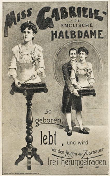 Miss Gabrielle, de son vrai nom Gabrielle Fuller, née vers 1884 à Bâle (Suisse), fut une figure marquante des spectacles de curiosités de la fin du XIXᵉ siècle. Elle se produisait sous le nom de scène Miss Gabrielle, présentée sur les affiches allemandes comme « Die Englische Halbdame » (la demi-dame anglaise), une appellation volontairement inexacte destinée à ajouter une touche d’exotisme à son personnage. Née avec une agénésie des membres inférieurs, comme Eli Bowen, Miss Gabrielle était particulièrement admirée pour l’élégance de son buste, la finesse de ses traits et le soin apporté à sa présentation. Ce contraste entre la grâce féminine et l’absence de jambes constituait le cœur de sa fascination scénique, renforçant l’émotion et l’étonnement du public. Les affiches et photographies la montrent posée sur un socle, mise en scène avec sobriété et dignité, soulignant à la fois la réalité de sa condition et sa capacité à exister pleinement comme artiste. Miss Gabrielle incarne ainsi l’une des figures emblématiques des « demi-corps », où la singularité physique devient spectacle, mais aussi réflexion sur le regard porté sur les corps hors norme.